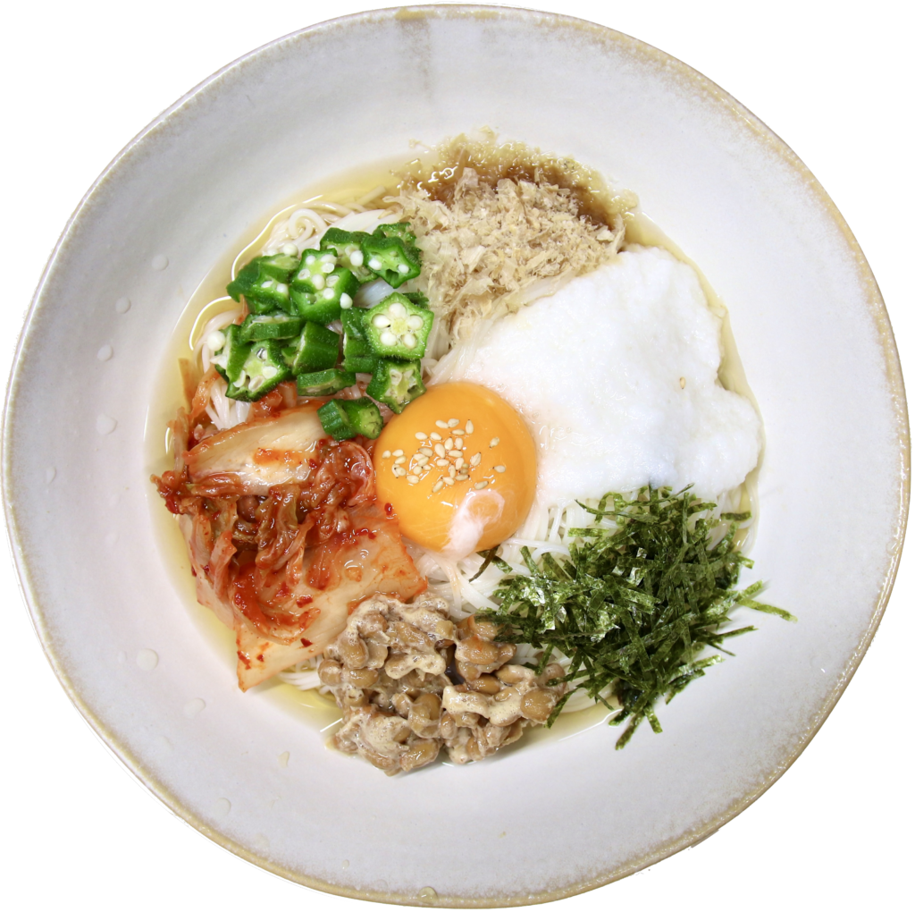 納豆、オクラ、キムチがアクセントの大人気そうめん‼しっかりと混ぜてねばねばと冷たい素麺は相性抜群。暑い日でもつるっとお腹を満たすことができます♪