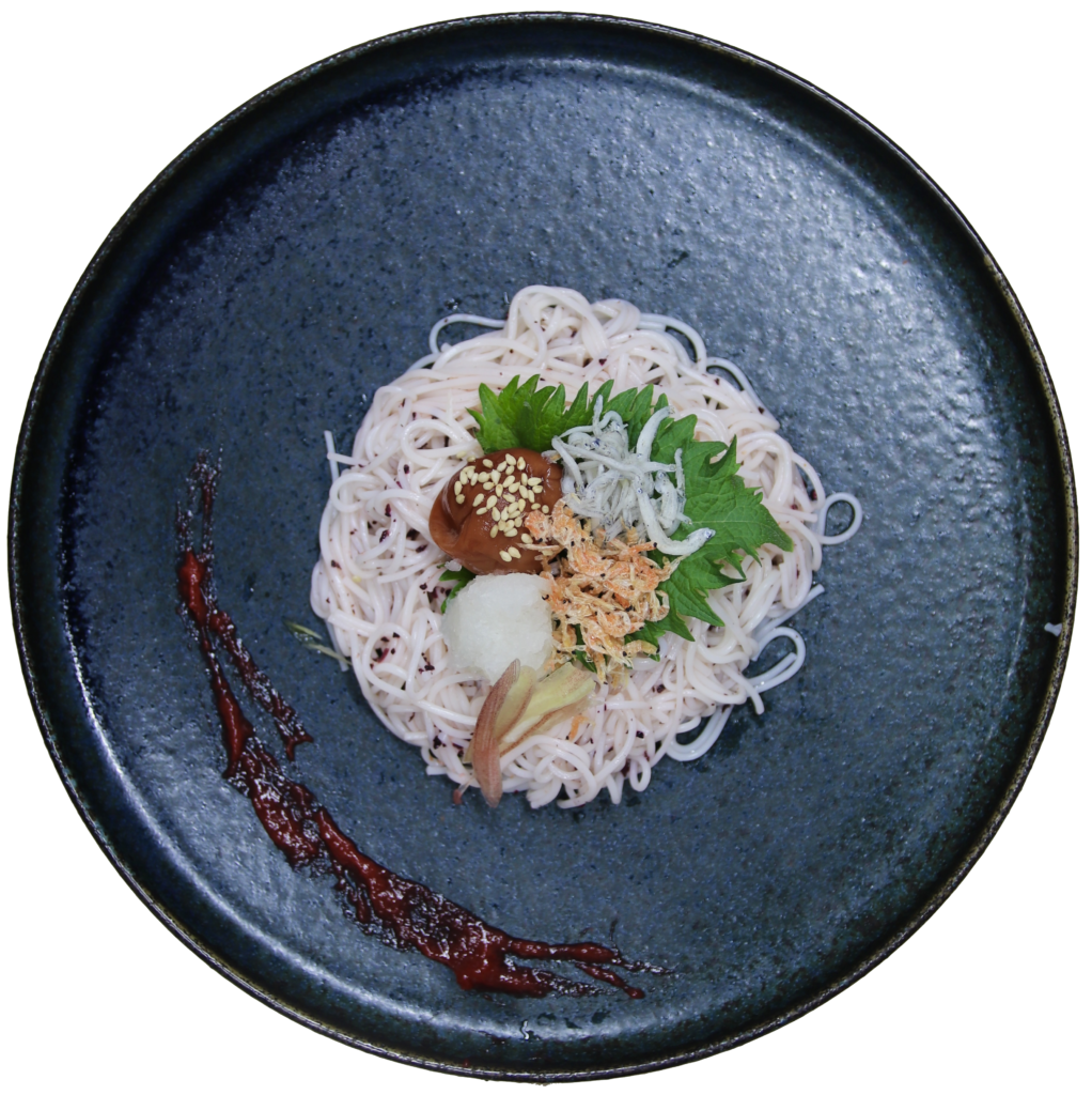 氷締めしたそうめんに、ゆかりと特性梅のソースを絡ませ、